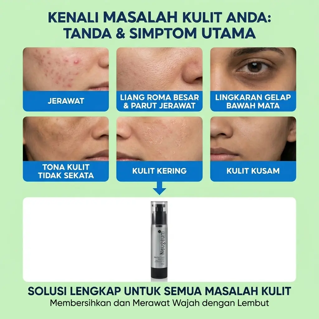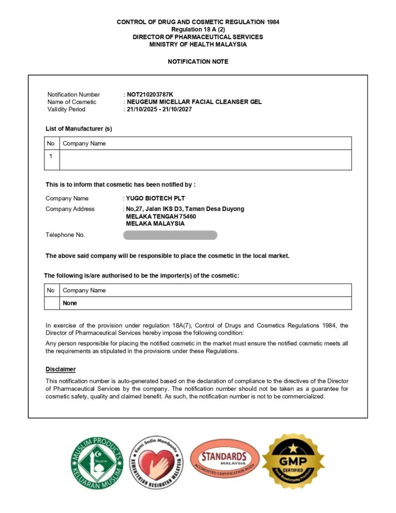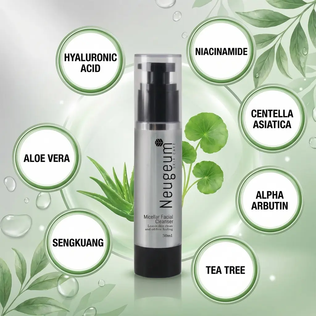 NEUGEUM diformulasikan dengan 7 bahan premium iaitu Hyaluronic Acid, Niacinamide, Aloe Vera, Centella Asiatica, Alpha Arbutin, Sengkuang dan Tea Tree yang membantu membersihkan kulit wajah dengan lembut sambil menyokong tona kulit yang lebih cerah, sekata dan sihat.